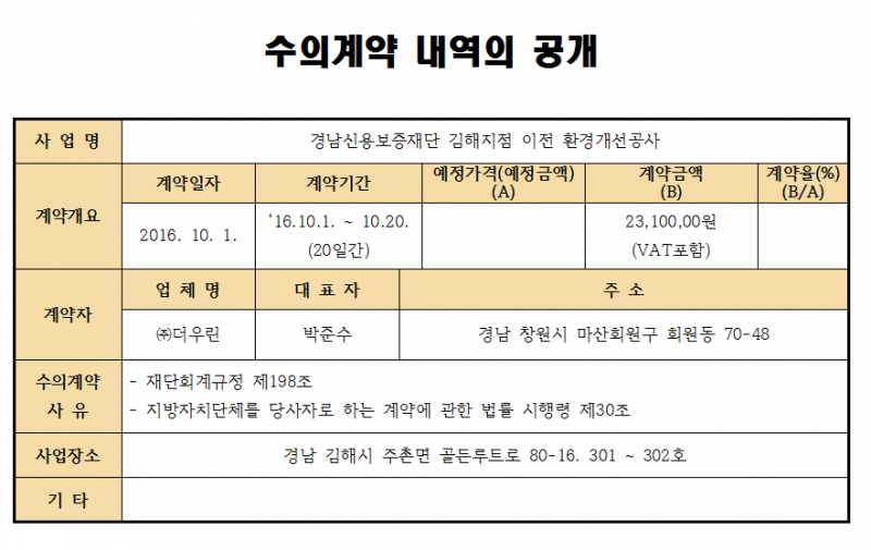 경남신용보증재단 김해지점 이전 환경개선공사 수의계약내역 공개-2016.10.01