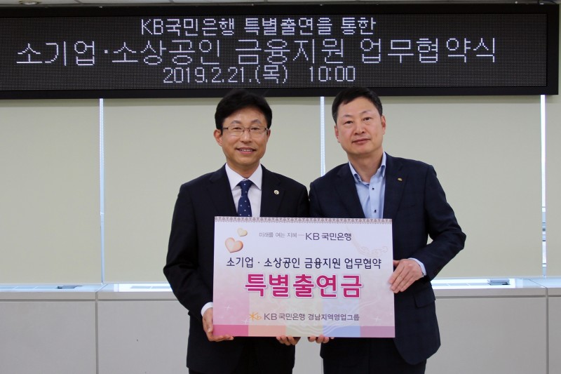 □ 경기침체로 경영난을 겪고있는 도내 소기업 및 소상공인에 대한 지원을 확대하기 위하여 KB국민은행이 6억원을 출연하고 우리재단과 협약식을 가졌다.