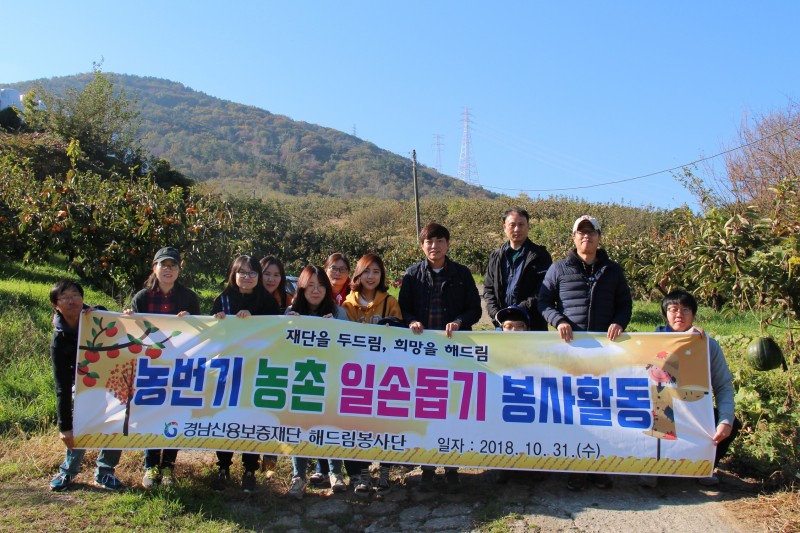 2018년도 농촌 일손돕기(단감수확) 봉사활동(18.10.31) 페이지 정보 작성자경남신용보증재단 댓글 0건 조회 1,190회 작성일 19-01-11 11:10 본문 □ 2018년 10월 31일, 경남신보 본·지점 직원 13명은 농번기를 맞아 일손이 부족한 지역 농가 일손돕기를 통해 지역사회에 공헌하고자 지역의 한 단감농장에서 단감수확작업을 하였다. 목록 이전글경남신용보증재단 제10대 구철회 이사장 취임(18.11.01) 19.01.11