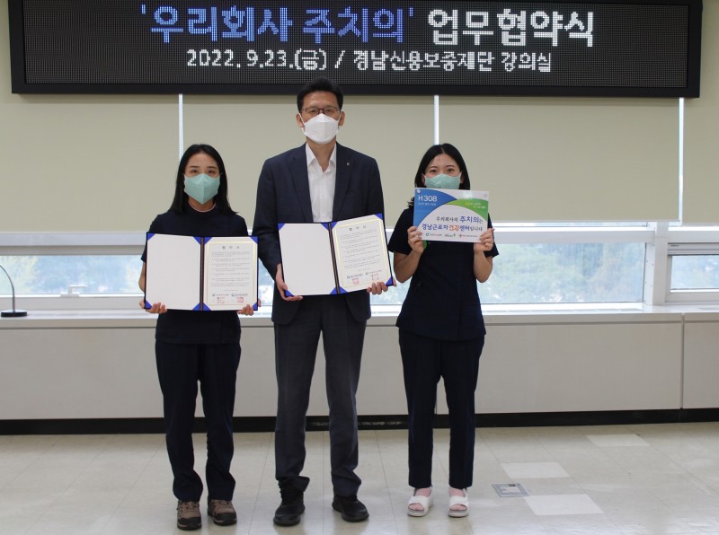 '우리회사 주치의' 협약 체결(2022.09.23) 페이지 정보 작성자경남신용보증재단 댓글 0건 조회 1,000회 작성일 22-10-13 16:41 본문 □ 경남근로자건강센터와 재단직원들의 건강과 심리적·정서적 안정을 지원하여 행복한 직장생활을 영위할 수 있도록 하는 협약을 체결하였다. 목록 이전글근로자지원프로그램(EAP) 실시(2022.09.23) 22.10.13 다음글해드림 봉사활동 실시(2022.09.01) 22.09.16