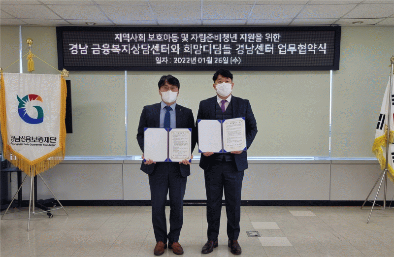 경남금융복지상담센터-희망디딤돌 경남센터 업무협약식(2022.01.26) 페이지 정보 작성자경남신용보증재단 댓글 0건 조회 945회 작성일 22-02-25 17:17 본문 □ 경남금융복지상담센터와 희망디딤돌 경남센터가 '보호종료아동'의 경제적 자립 지원을 위한 업무협약을 체결하였다. 목록 이전글2022년 제2차 이사회 개최(2022.02.25) 22.02.25 다음글일시멈춤 특례보증 협약식(2022.01.20) 22.02.25