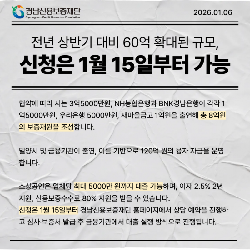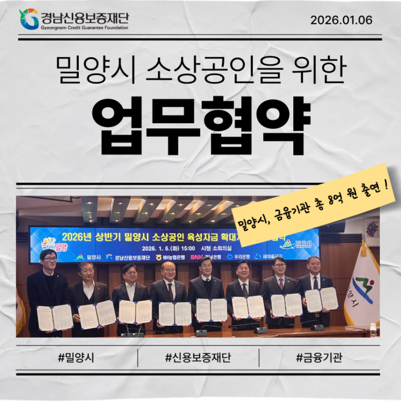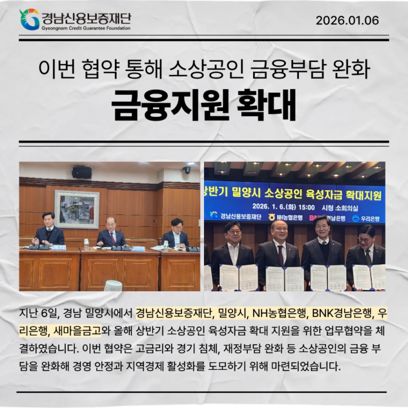 2026 상반기 밀양시 소상공인 육성자금 확대지원 협약 페이지 정보 작성자경남신용보증재단 댓글 0건 조회 34회 작성일 26-01-16 09:12 본문 ㅤ 목록 이전글2025 경남신용보증재단 연말 사회공헌활동 26.01.16